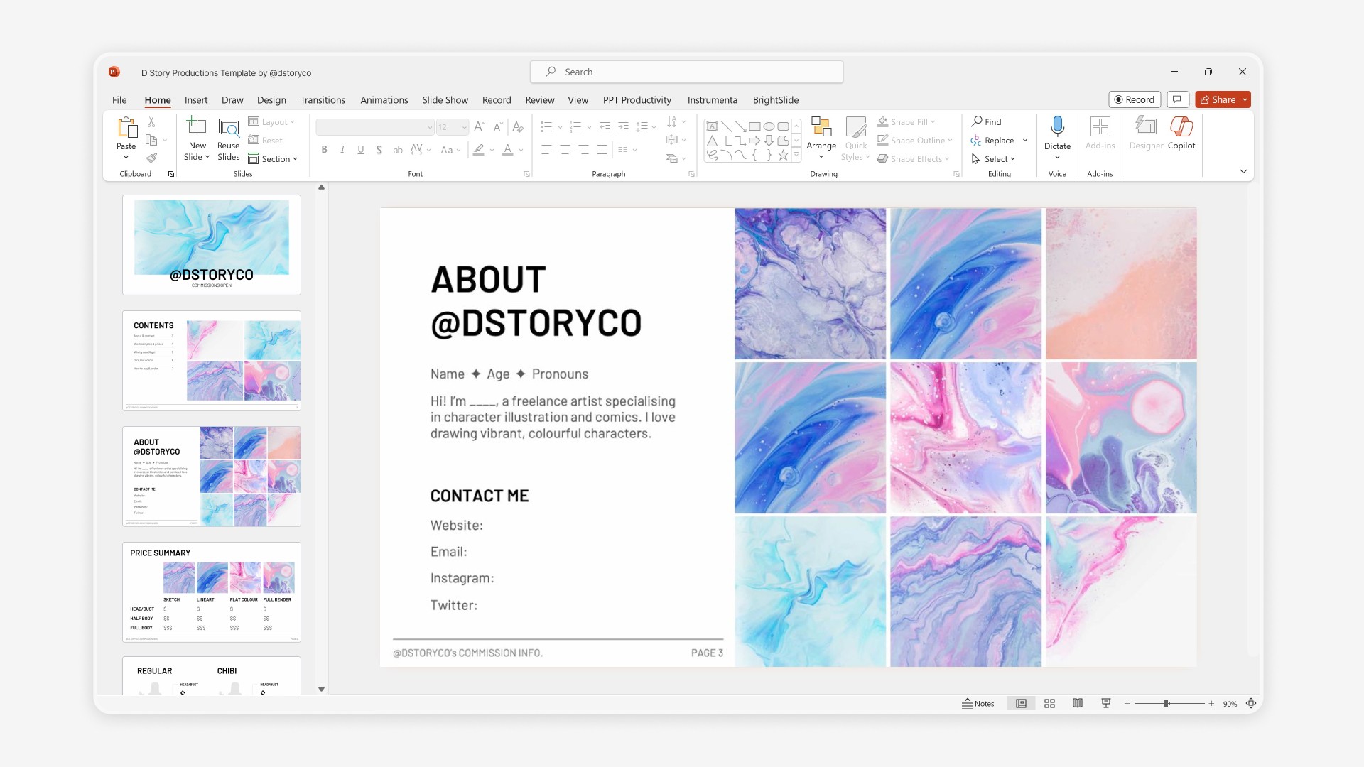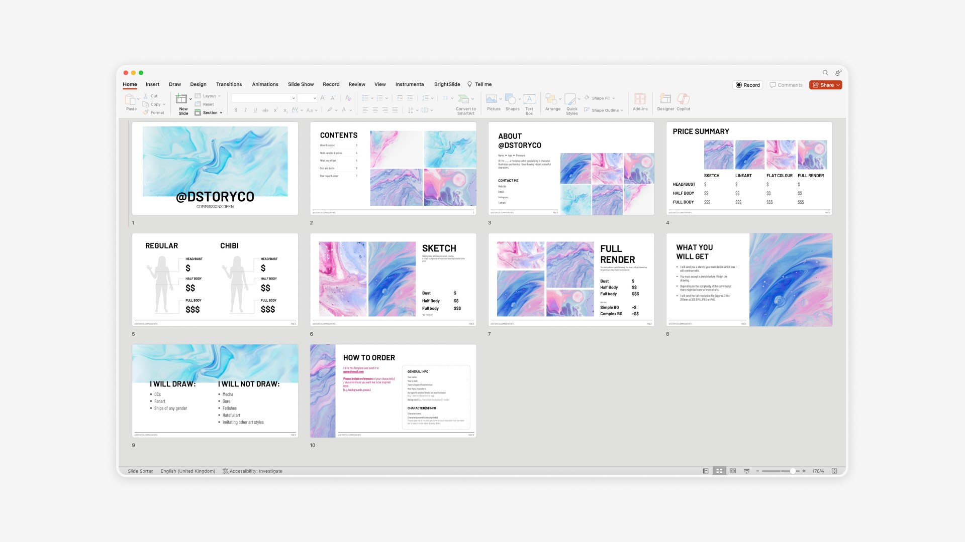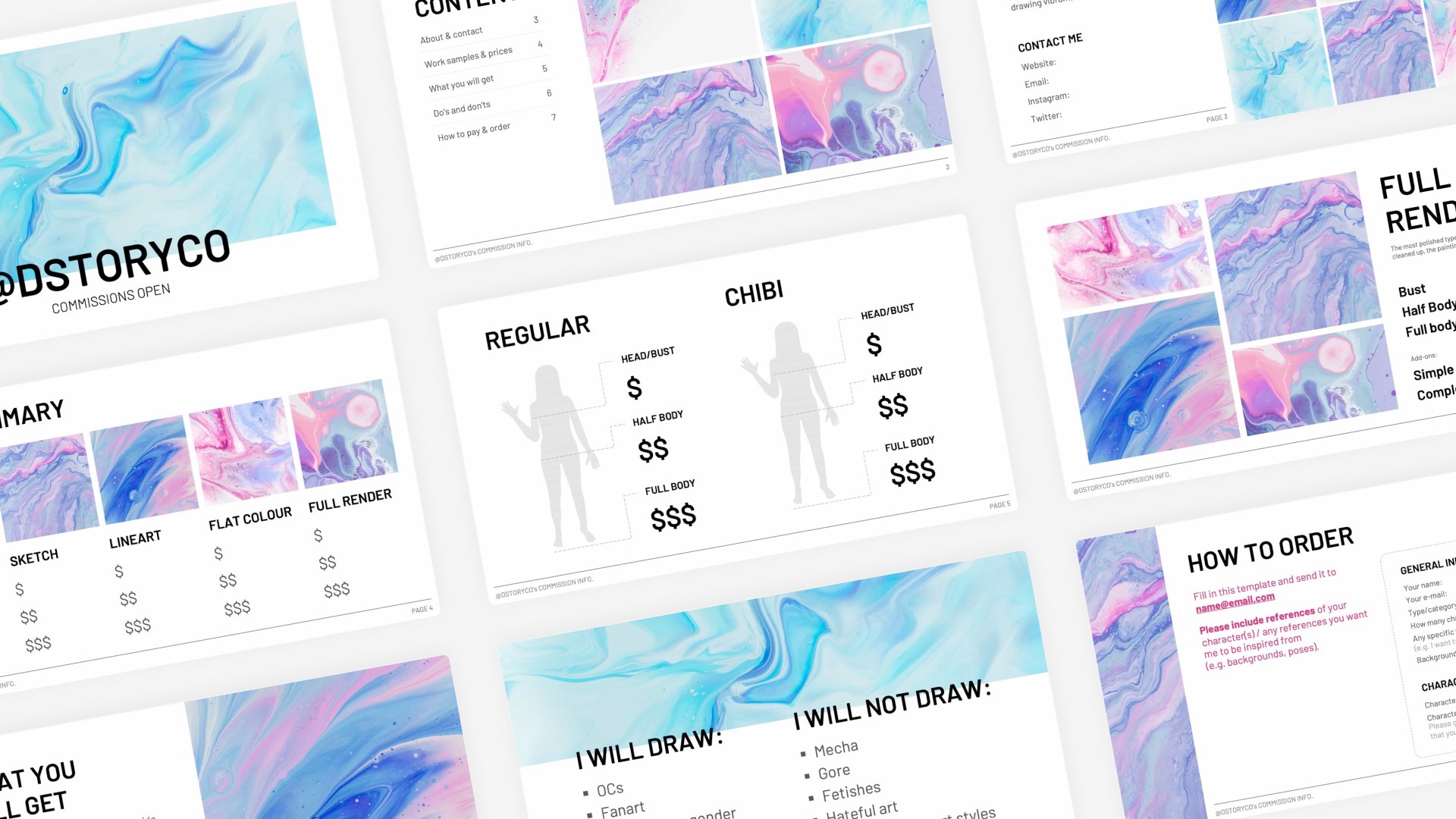 This is a free PowerPoint template for artists who are trying to send their commission information or use as a portfolio!