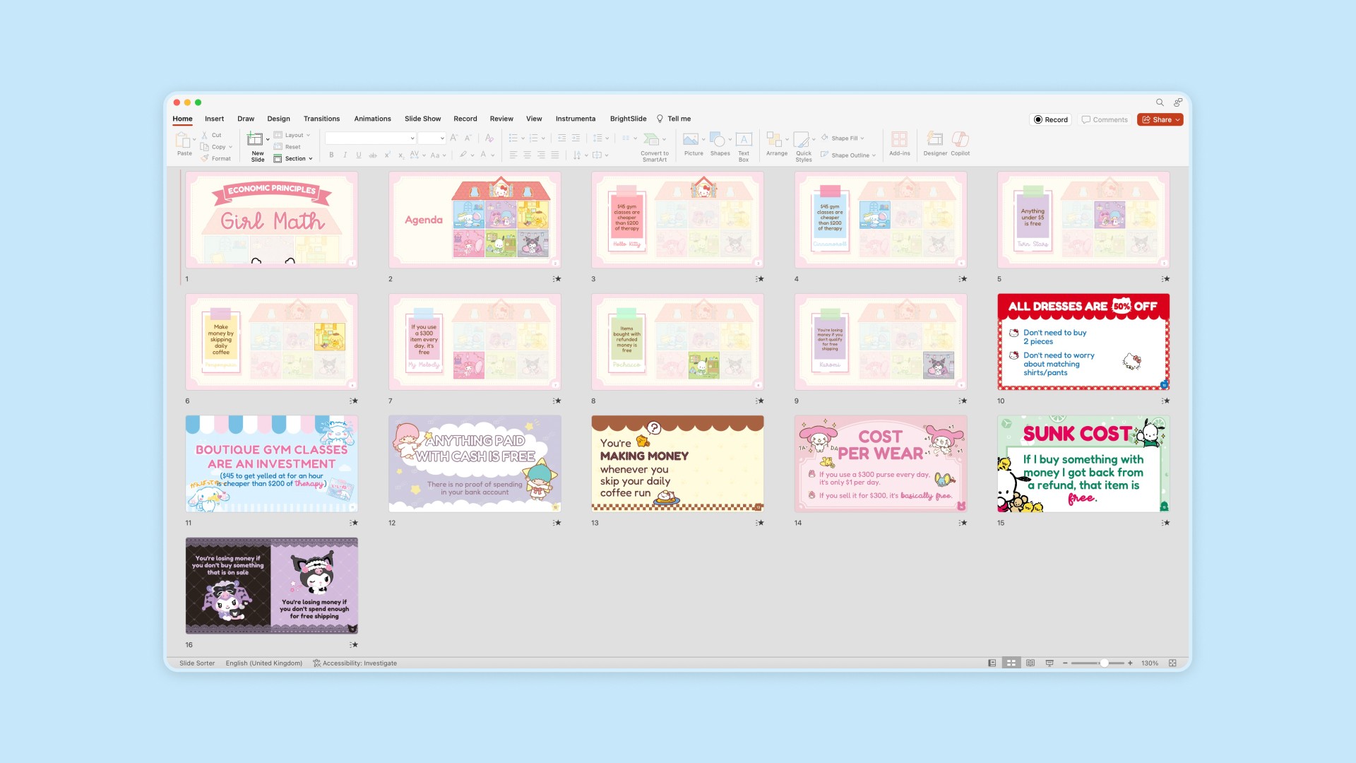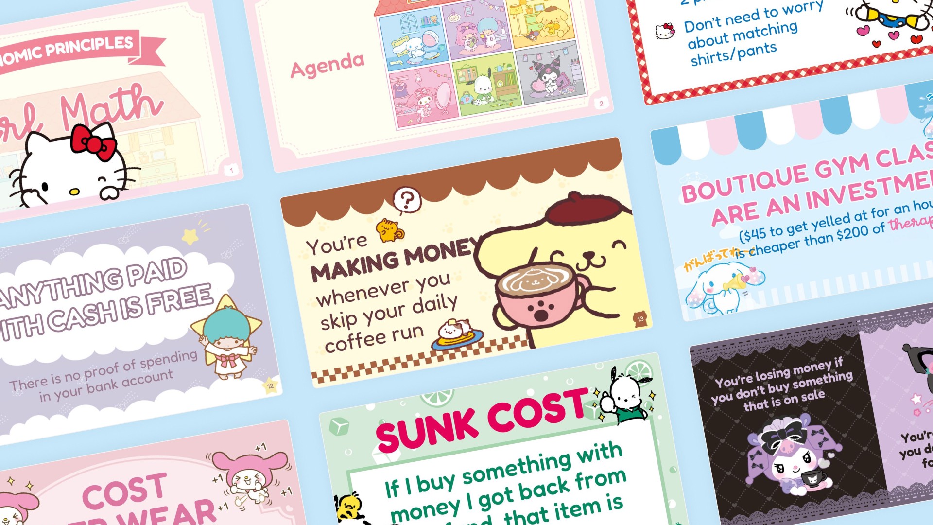 16 unique PowerPoint slide templates, featuring Hello Kitty, Cinnamoroll, My Melody, Kuromi, Pompompurin, Pochacco and Little Twin Stars!